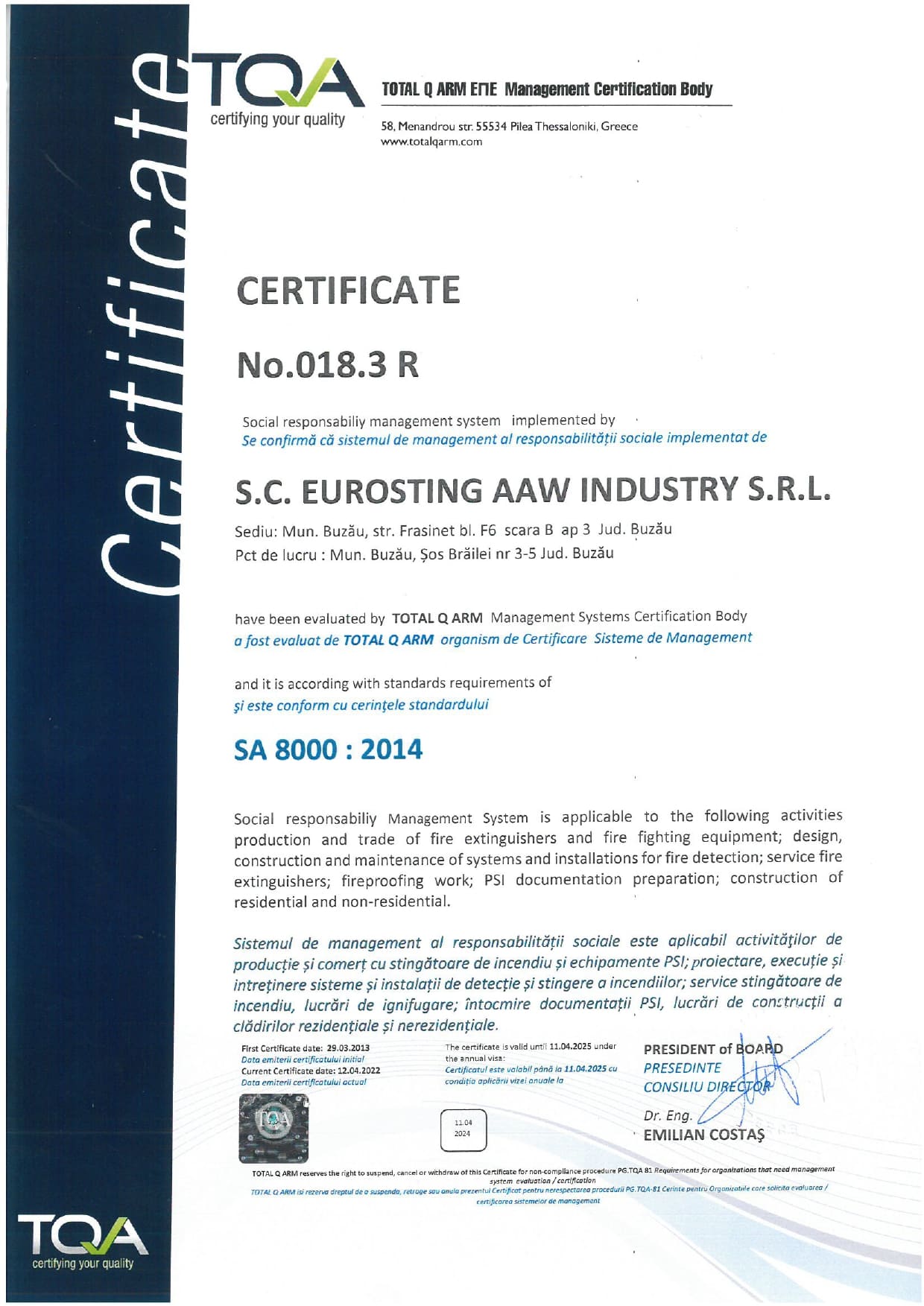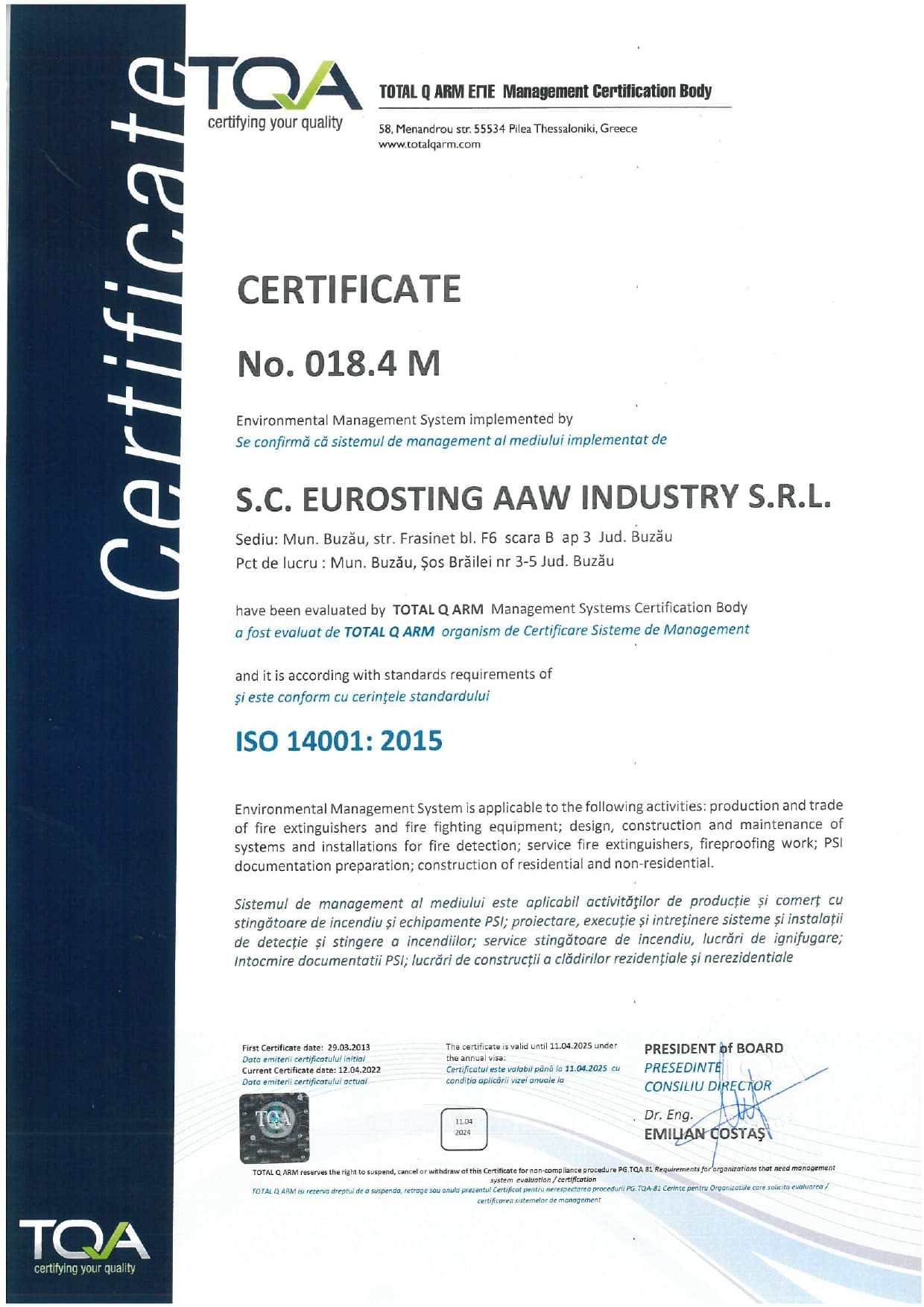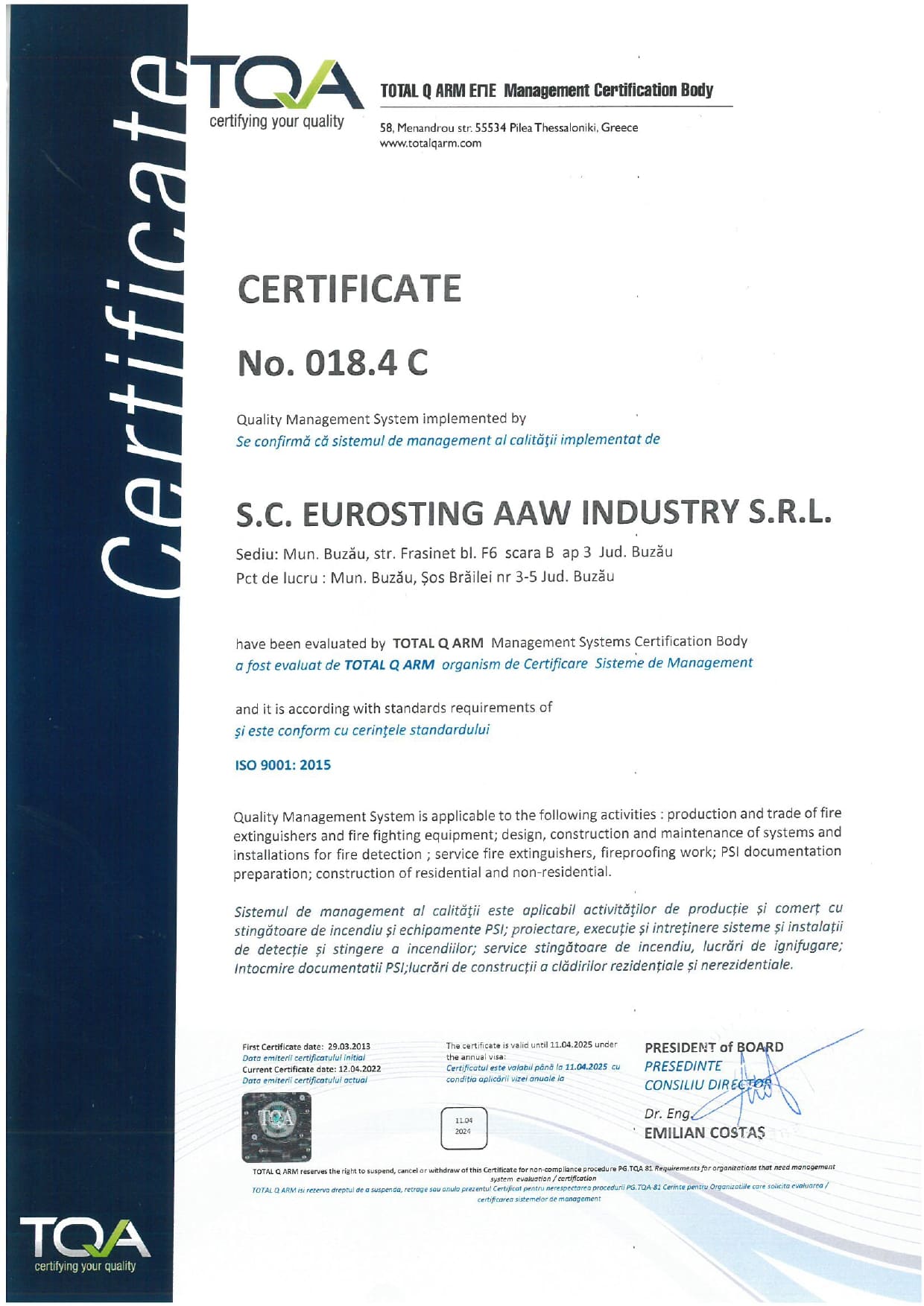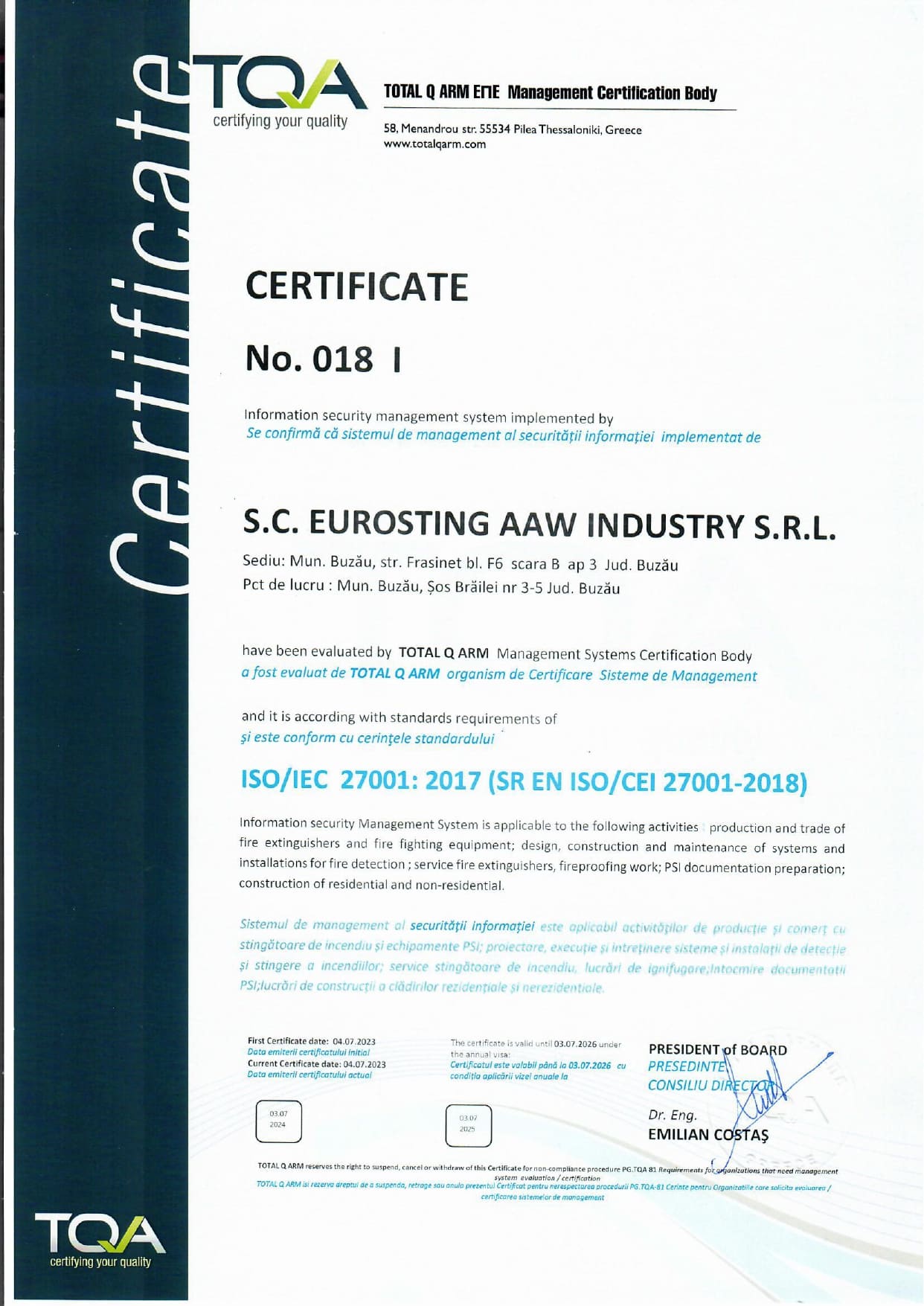 - Autorizatie seria A nr. 3186 din 19.02.2013 pentru instalare si intretinere a sistemelor si instalatiilor de limitare si stingere a incendiilor, cu exceptia celor care contin anumite gaze fluorurate cu efect de ser