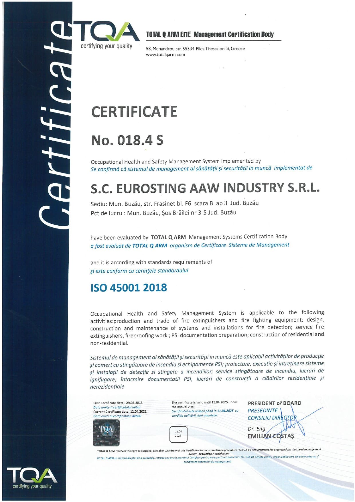- Autorizatie Seria A, nr. 4597 pentru efectuarea lucrarilor de intretinere a instalatiilor speciale din compunerea autospecialelor destinate apararii impotriva incendiilor, emisa de IGSU